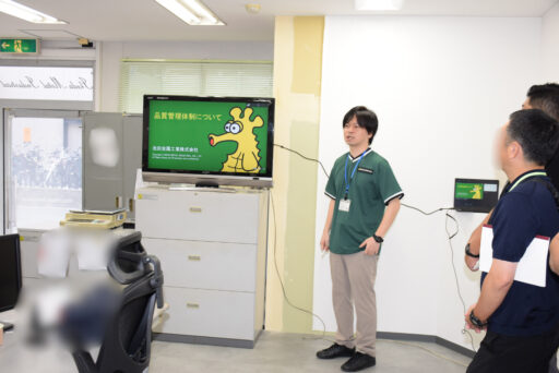 次に、弊社の品質管理室で、体制や製品入荷・納品までの流れをご説明、試験機のご説明、物流倉庫では、弊社拠点、どのような運用で製品棚に配置しているか、ピッキングにどういった流れや仕組みで梱包しているかをご案内いたしました。