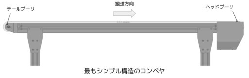 たとえばコンベヤの構造の中で最もシンプルなのは、コンベヤの下流側に駆動用の軸とプーリを1つずつ、コンベヤの上流側に柔道用の軸とプーリを1つずつ配置する手法です。