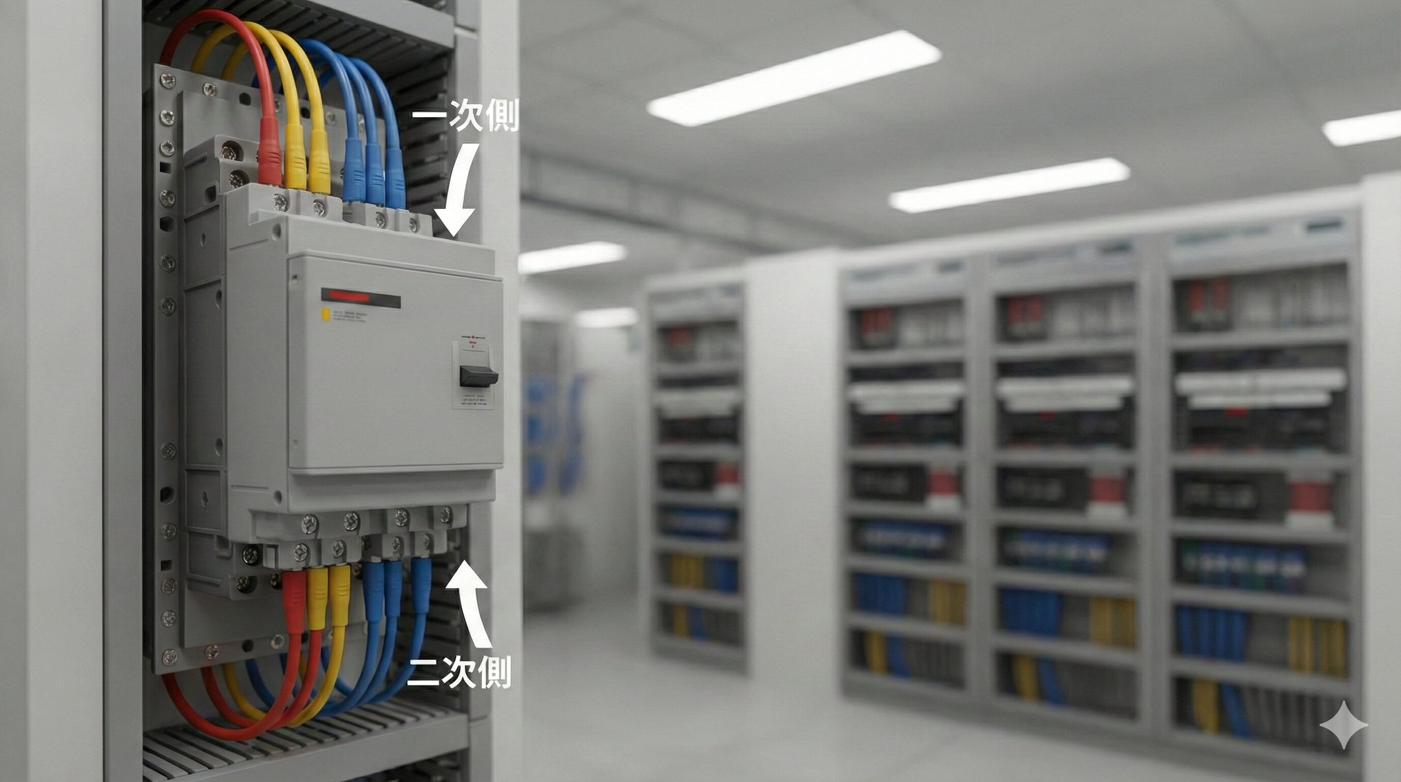 これはある特定の機器(例えばブレーカ)を対象に見たときに、電気が来る方を「一次側」、電気を送る方を「二次側」と呼び、電気関係の仕事をする上では非常によく出てきます。