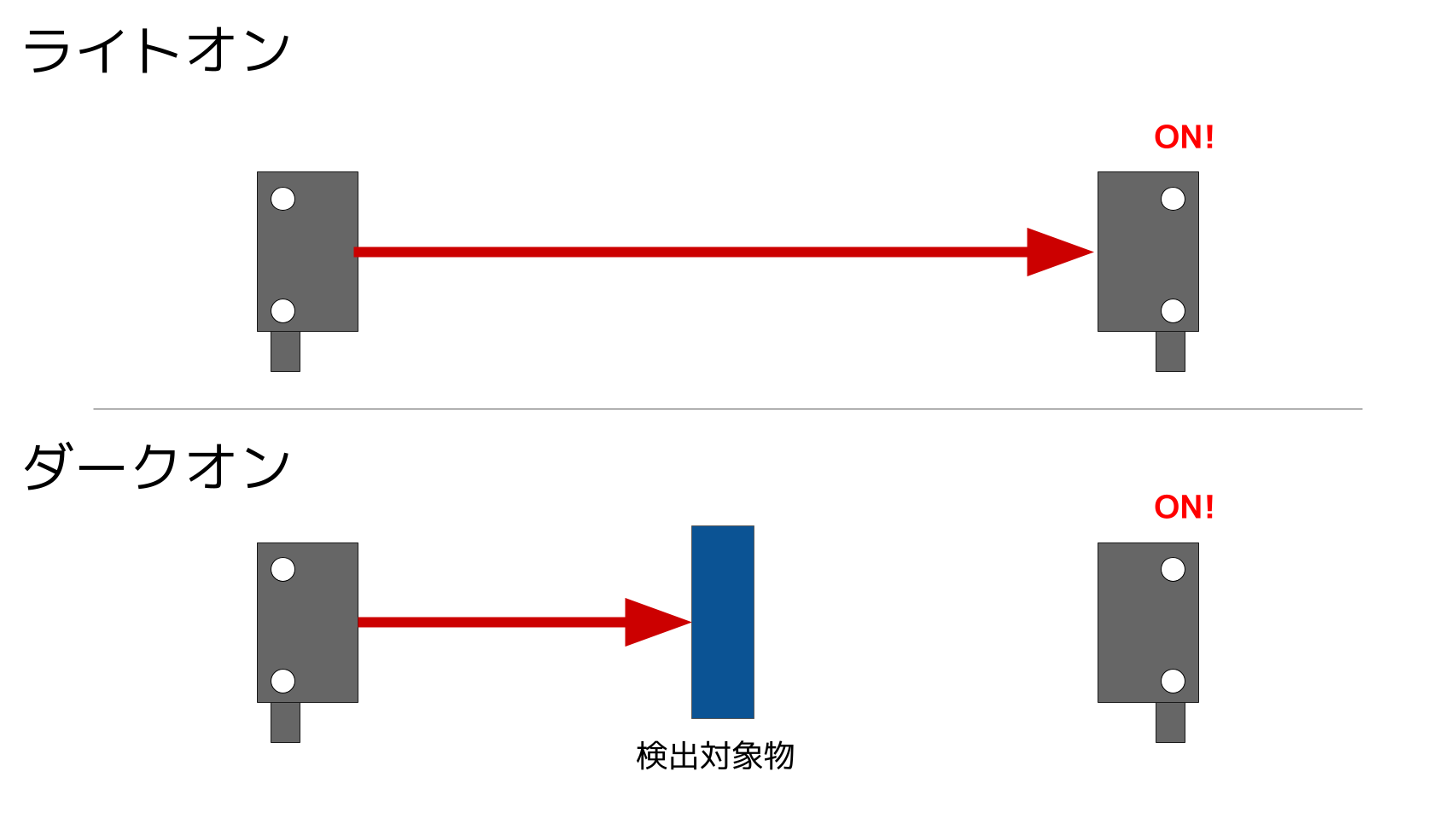 - ダークオン: 受光部で光を受光できなかった(遮光された)際にON信号を出力する