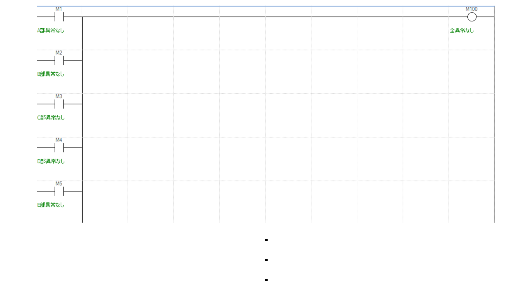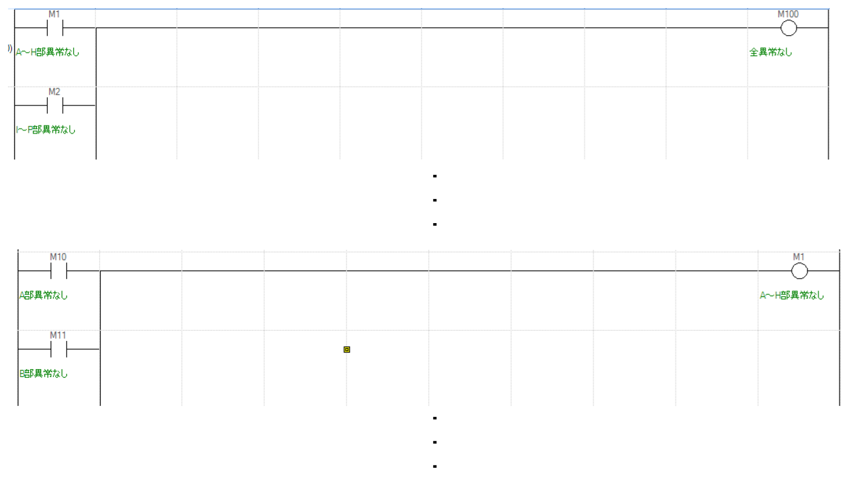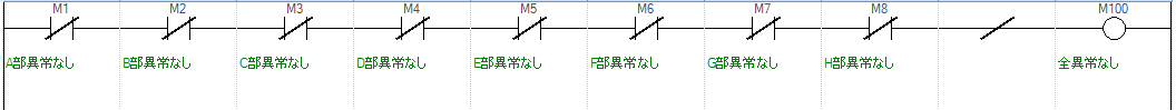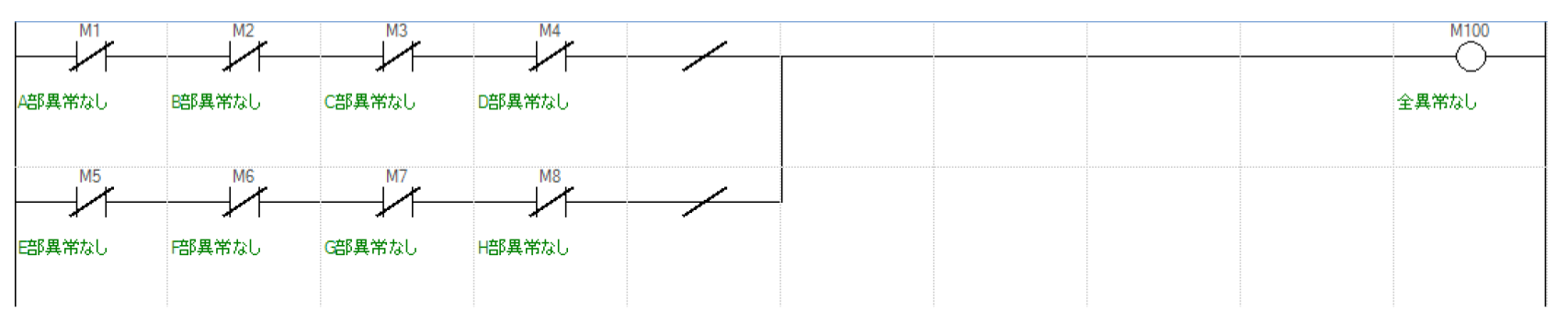 よくあるのが異常関係の回路で、「○○の異常がなく、かつ○○の異常がなく、かつ○○の異常がなく・・・」というように、たくさん(多い場合ですと100個近くになります)の接点をORで繋いで回路をつくることが多くなります。