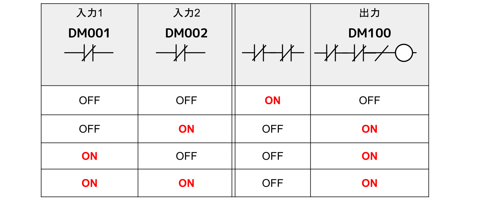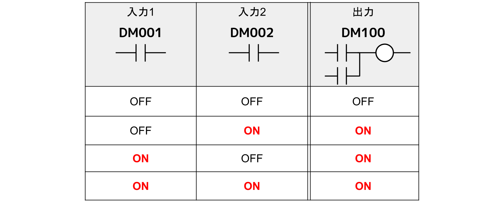 OR回路の挙動は「入力のいずれか一つでもONすれば出力がON」となることから、入力は2つともA接点であるとして論理表で表すと以下の通りとなります。