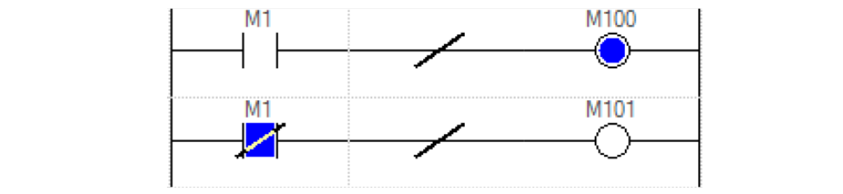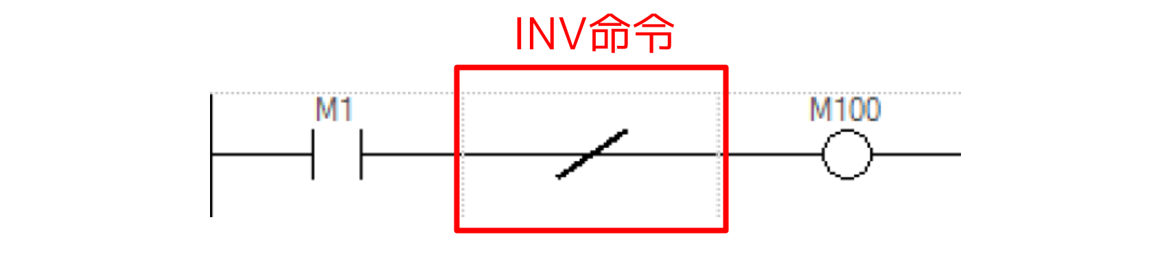 INV命令とは「その直前までの演算結果(ON/OFFの状態)をひっくり返す命令」であり(論理演算を習ったことがある方は「NOT回路」と同じだと思ってください)、ラダー回路上では斜め線で表示される場合が多いです。