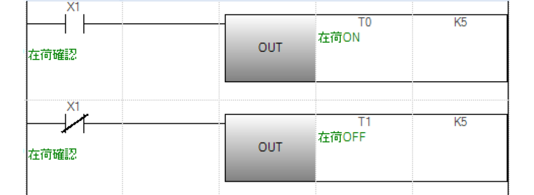 そこで以下のようにINV命令を導入することで、一つの接点だけを使って2つの異なるタイマのON/OFFを実装することができます。